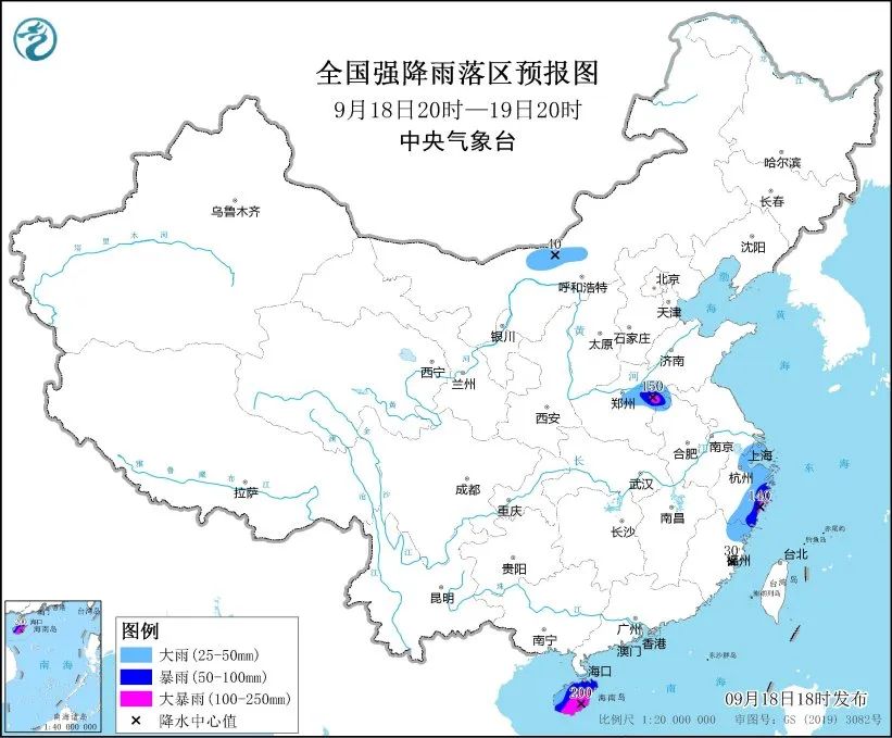中央表象台9月18日18时连接发布暴雨黄色预警: 预测,9月18日20时至19日20时,河南东部、山东西南部、安徽北部、江苏南部、上海、浙江东部、福建东北部、海南岛以及内蒙中部等地部分地区有大到暴雨。其中,河南东部、浙江东部沿海、海南岛东南部等地部分地区有大暴雨(100至200毫米)。上述部分地区伴有短时强降水(最大小时降雨量20至50毫米,局地可跳跃60毫米),局地有雷暴大风等强对流天气。